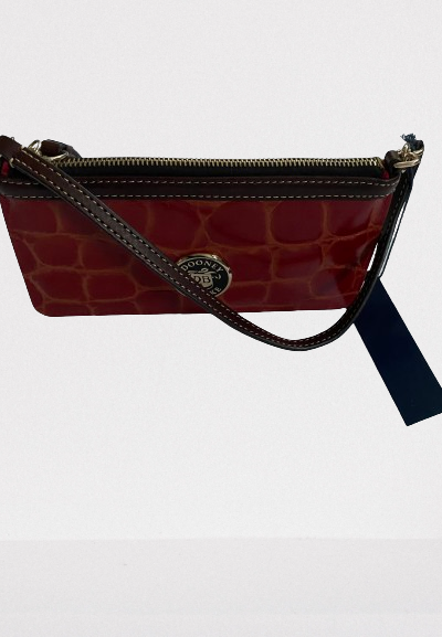 This Dooney and Bourke Monogram wristlet wallet purse is the perfect accessory for any occasion. The beautiful wine color of the exterior leather material is complemented by a brown leather handle/strap and silver hardware. The zip closure ensures that your belongings stay secure inside the bag, which has a width of 7 inches, height of…